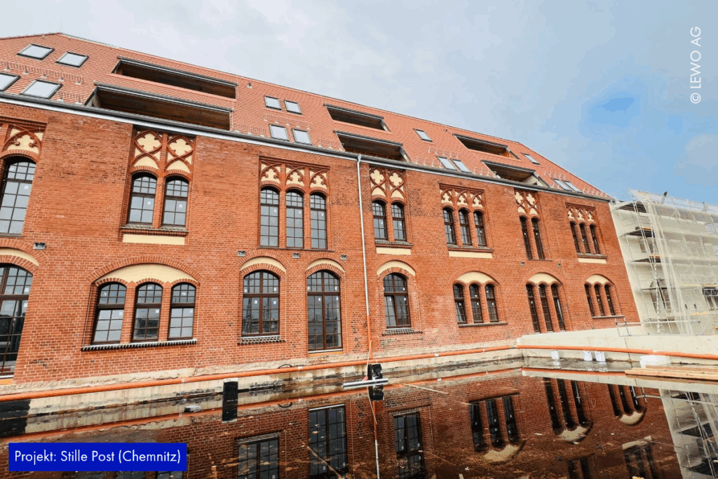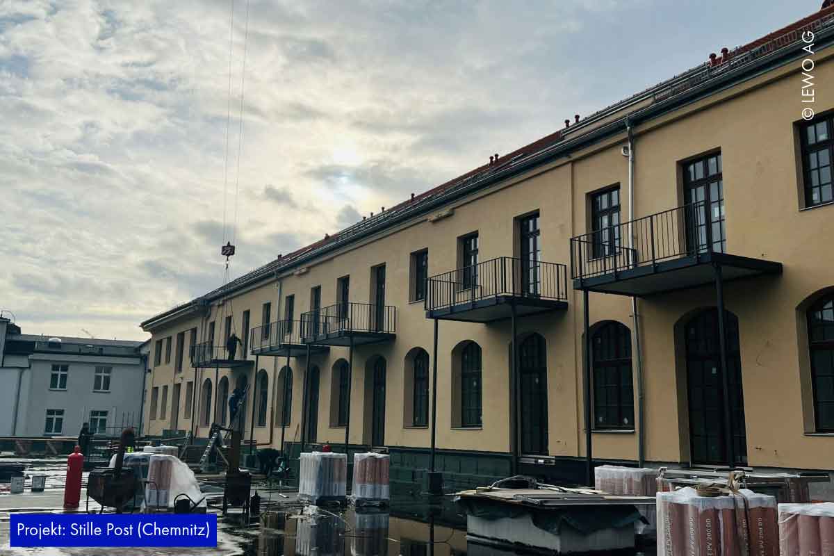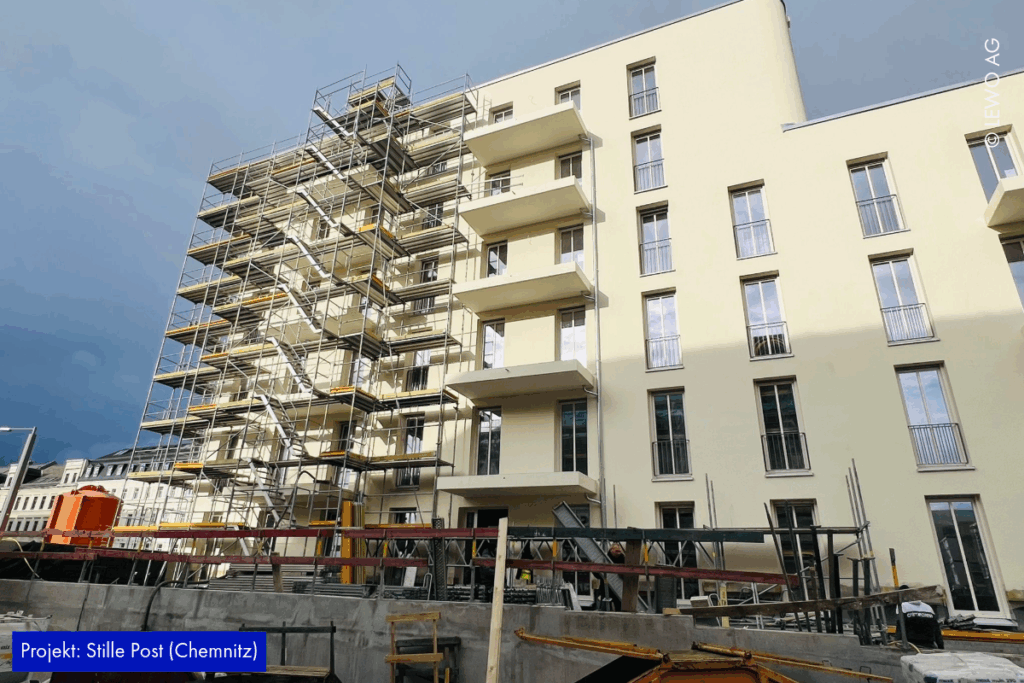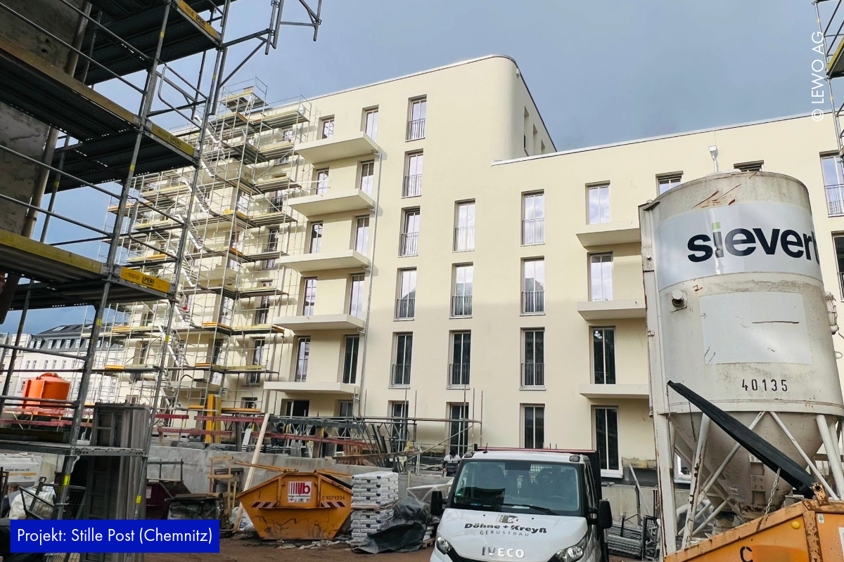 Die Bauarbeiten an der Stillen Post in Chemnitz schreiten sichtbar voran: Der Neubau hat seine Hülle fast vollständig abgelegt. Das Gerüst wird nach und nach entfernt und gibt den Blick auf die frisch fertiggestellte Fassade frei. In hellem Ton und mit klarer Formensprache fügt sich das Gebäude harmonisch in das historische Ensemble ein und bildet einen spannenden Kontrast zur denkmalgeschützten Ziegelfassade des Altbaus.
