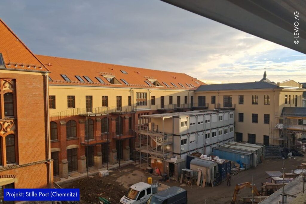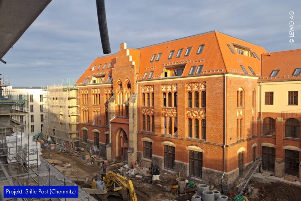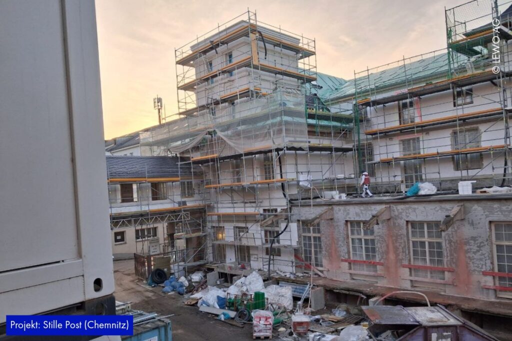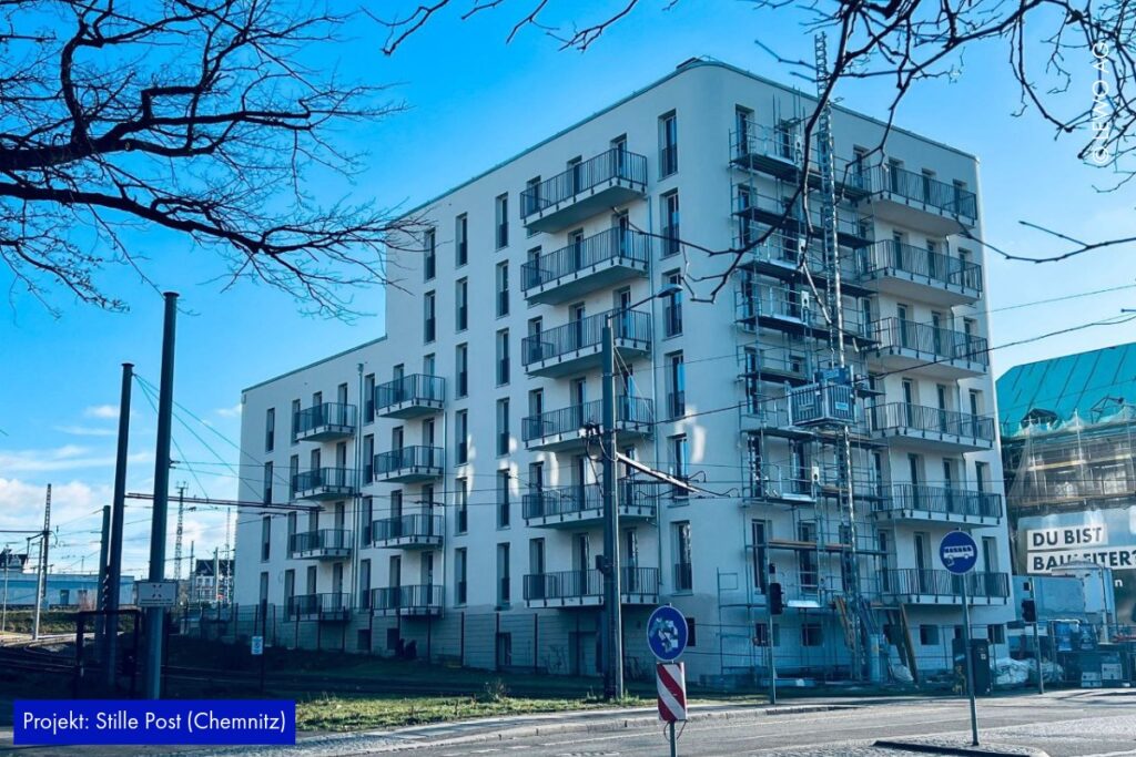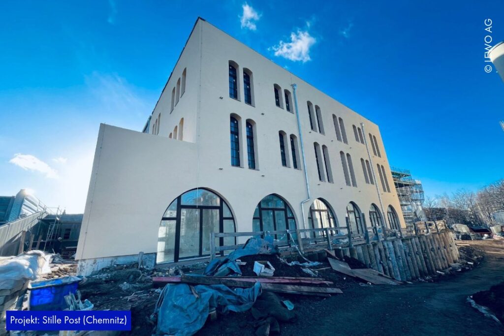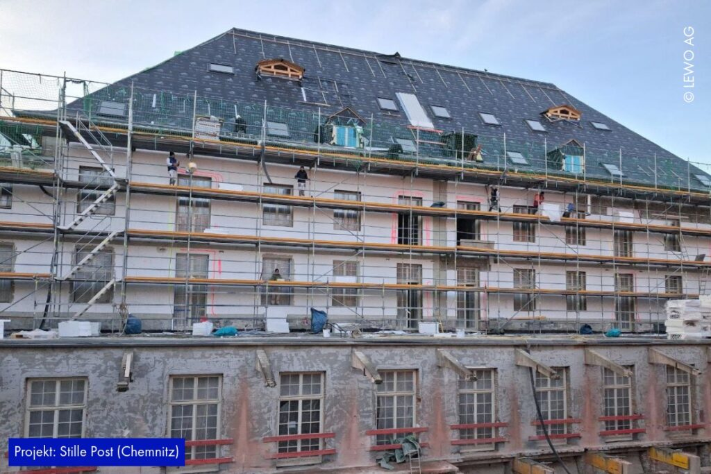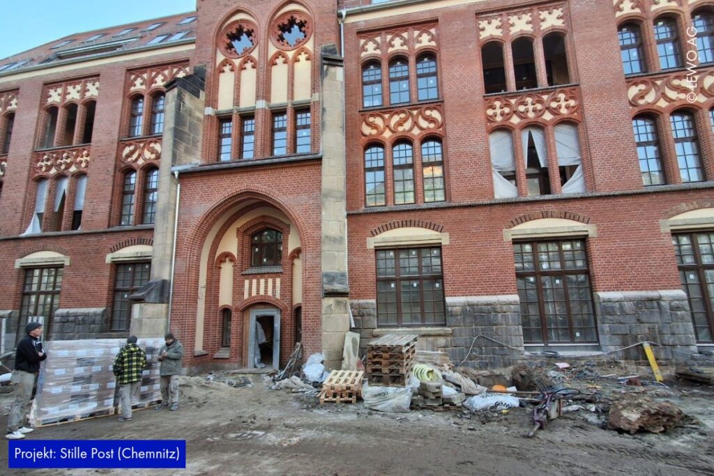 Auf der Baustelle der Stille Post in Chemnitz nimmt das Projekt immer mehr Form an. Im Inneren läuft der Ausbau kontinuierlich weiter – Räume werden definiert, Oberflächen vorbereitet und die letzten handwerklichen Schritte greifen ineinander. Gleichzeitig zeigt sich außen bereits das zukünftige Gesicht des Ensembles: Das Fassadengerüst ist abgerüstet, sodass die frisch hergestellte Gebäudehülle erstmals vollständig sichtbar wird.