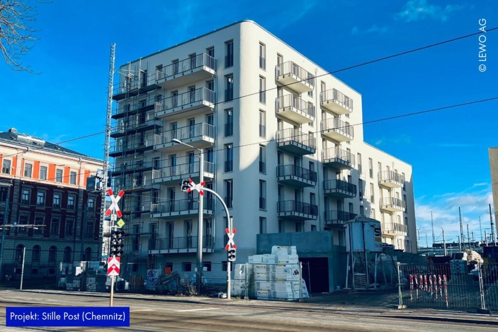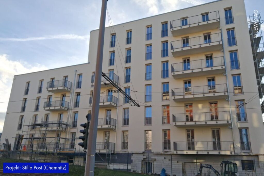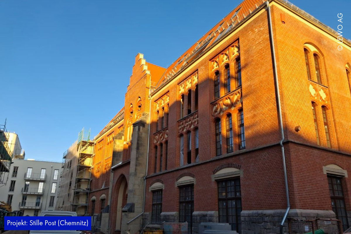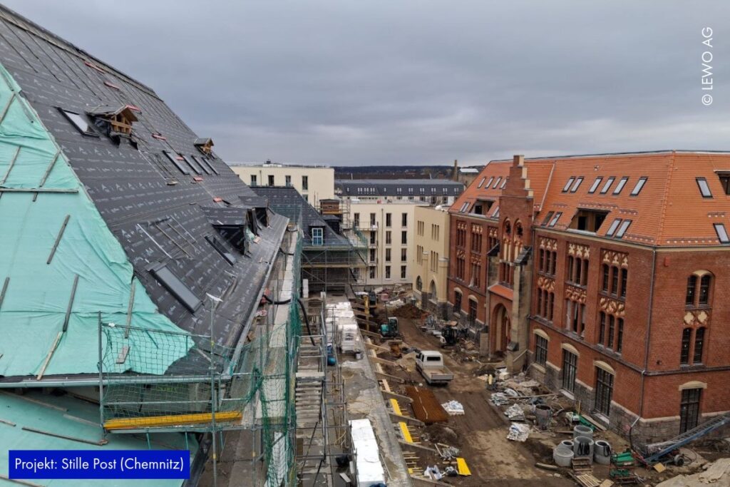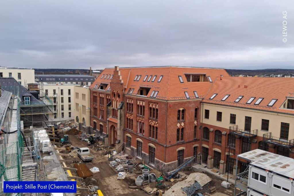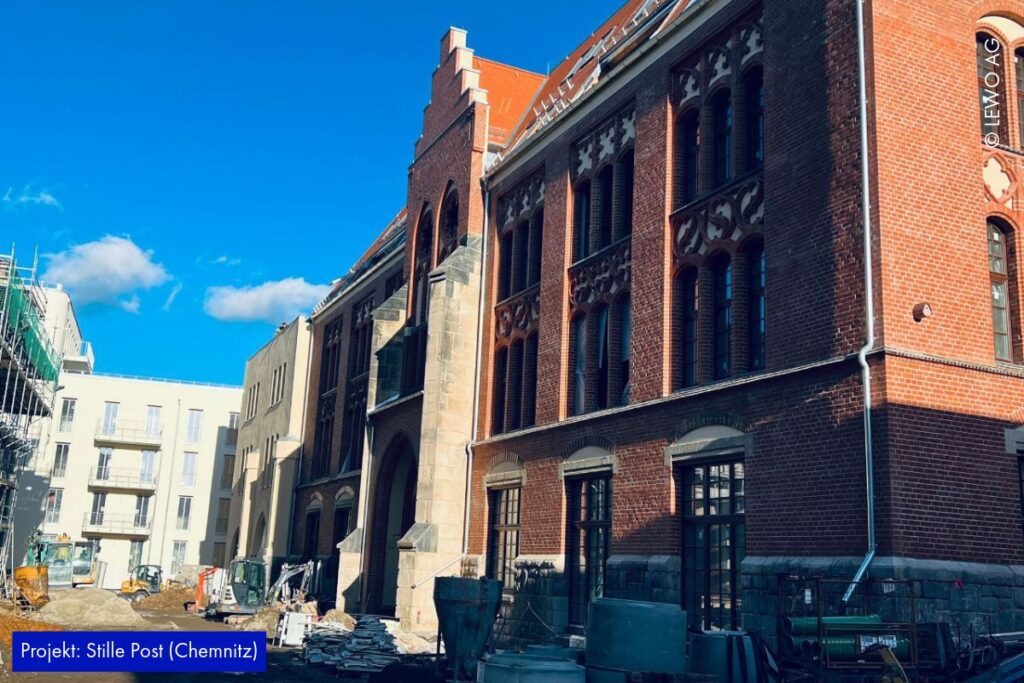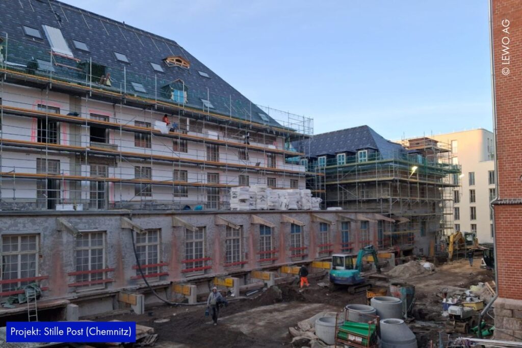 Auf der Baustelle der Stille Post in Chemnitz nimmt das Projekt immer mehr Form an. Im Inneren läuft der Ausbau kontinuierlich weiter – Räume werden definiert, Oberflächen vorbereitet und die letzten handwerklichen Schritte greifen ineinander. Gleichzeitig zeigt sich außen bereits das zukünftige Gesicht des Ensembles: Das Fassadengerüst ist abgerüstet, sodass die frisch hergestellte Gebäudehülle erstmals vollständig sichtbar wird.